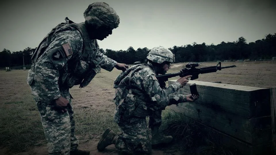 M. Elias (right) participates in a training exercise in the U.S. Army. Elias received marksmanship training during his time in the Explorer program in Nogales, AZ.